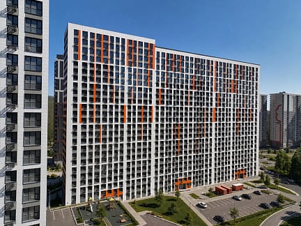 Архитектурная концепция проекта строится на балансе современного городского стиля и природного окружения. Выразительный силуэт и динамичный облик застройки органично вписываются в окружающий ландшафт. Фасады решены в светлой базовой гамме с яркими цветовыми акцентами, подчеркивающими вертикали зданий и задающими архитектуре ритм и характер. Интегрированные в фасады корзины для кондиционеров становятся частью общего рисунка, добавляя композиции глубину и выразительность, а входные группы, встроенные в объем домов, формируют акцент на уровне первого этажа и усиливают целостность архитектурного образа.
