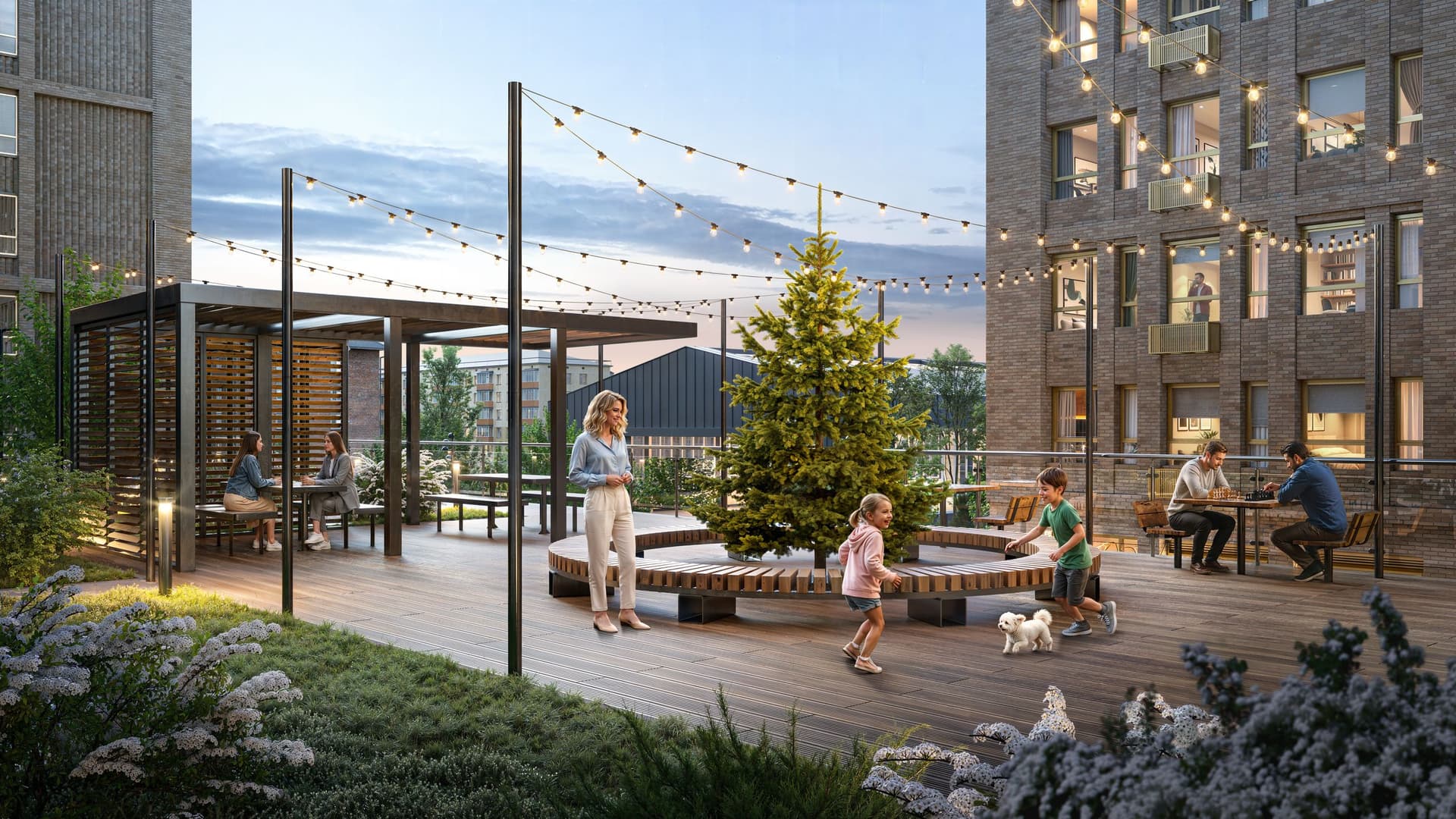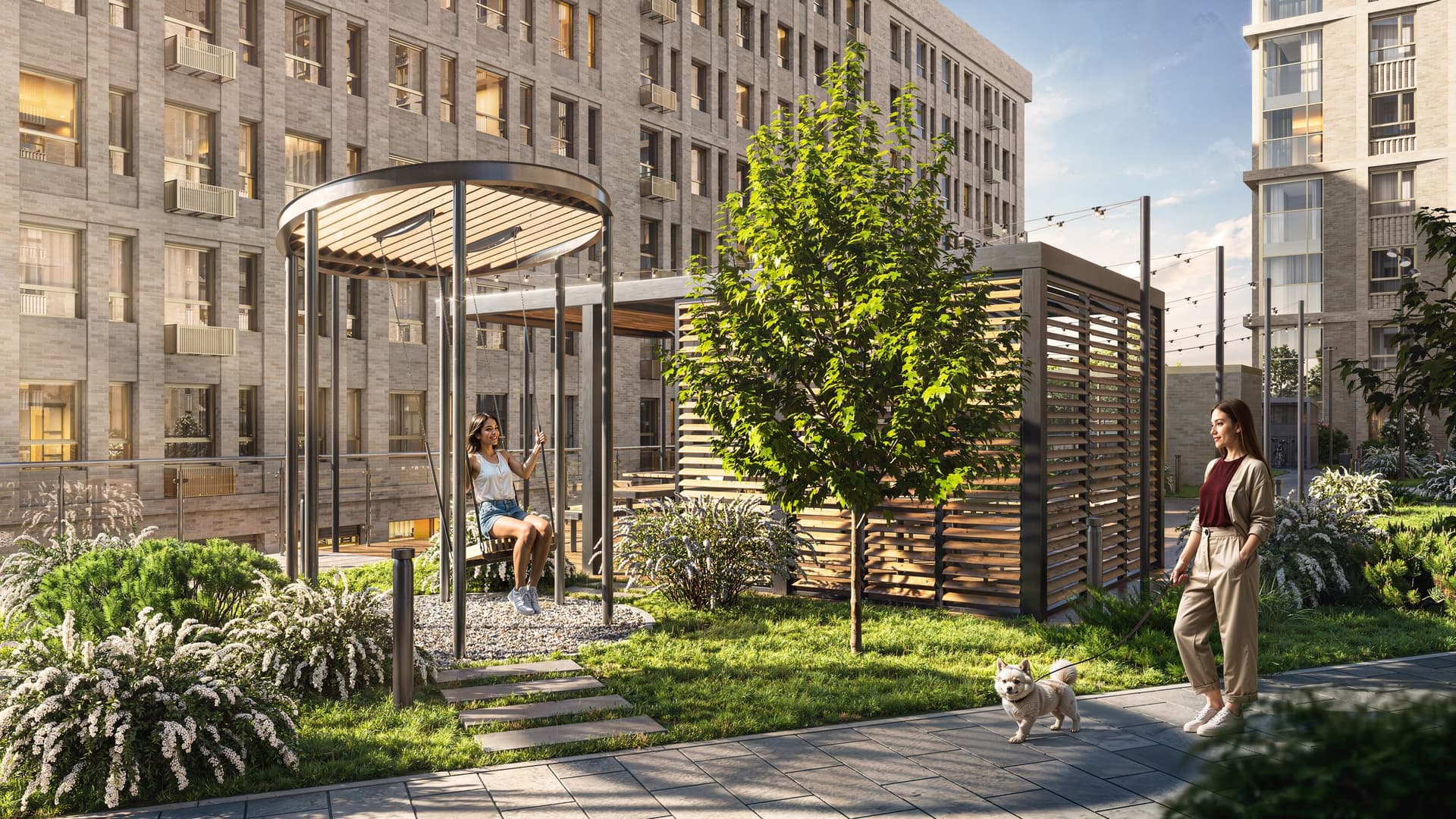 Главная идея комплекса – гармония города и природы. Здесь архитектура строгих линий сочетается с зеленью двора, напоминающего природный лесопарк, где воплощается многообразие сценариев жизни: от утренней зарядки в зоне воркаута до вечерних прогулок по уютным аллеям и встреч в комьюнити-центре.